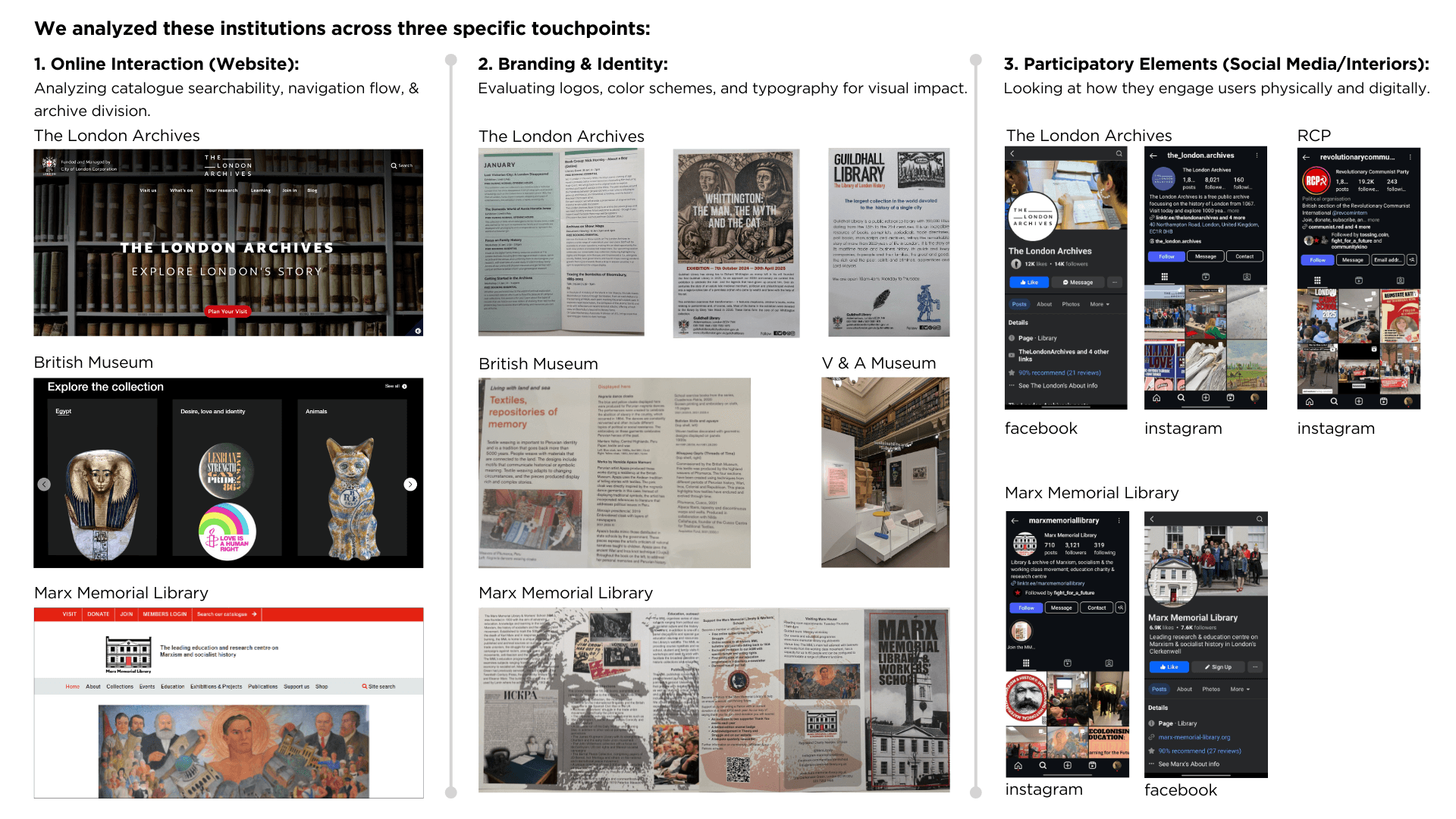 Benchmarking targets: British Museum, London Metropolitan Archives, and Marx Memorial Library (MML) as baseline.