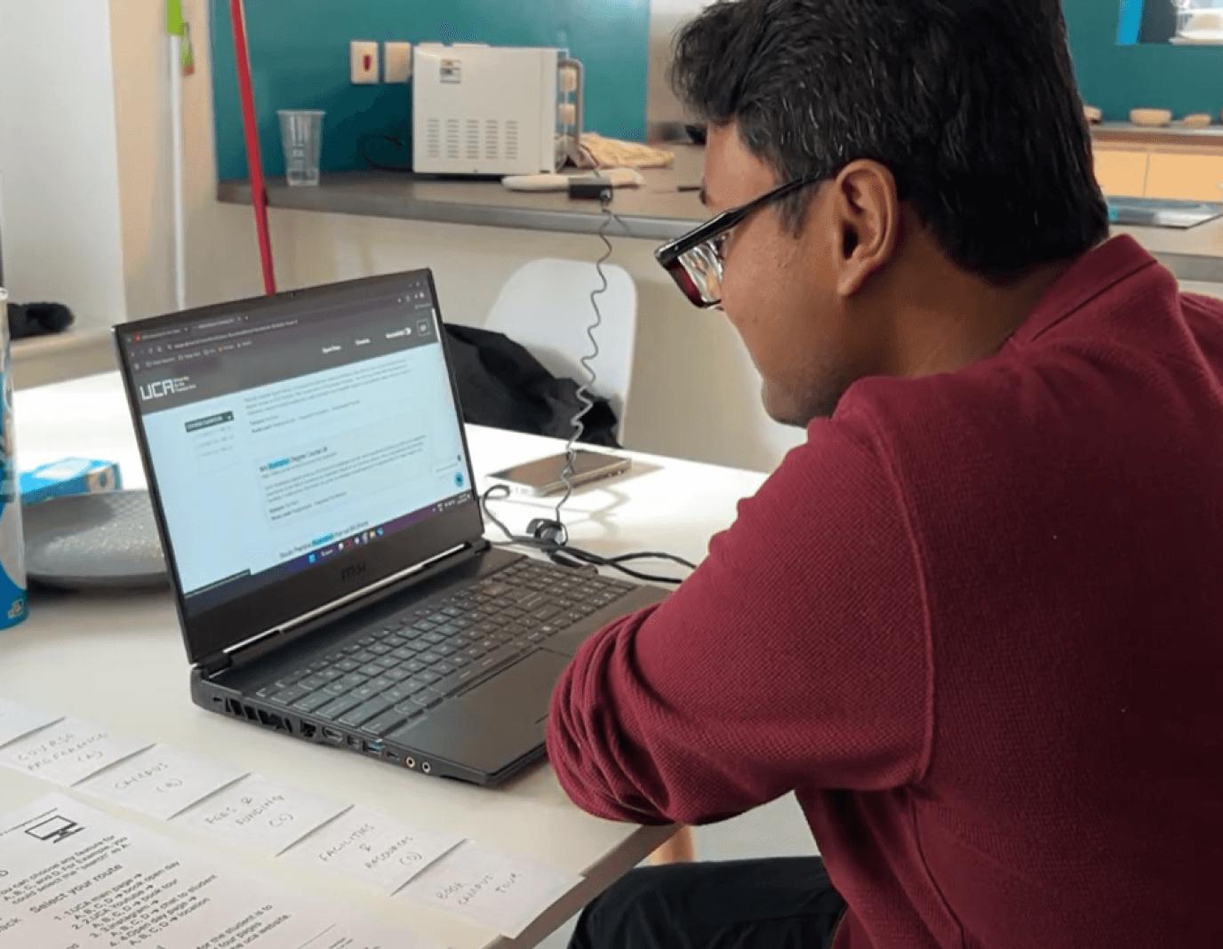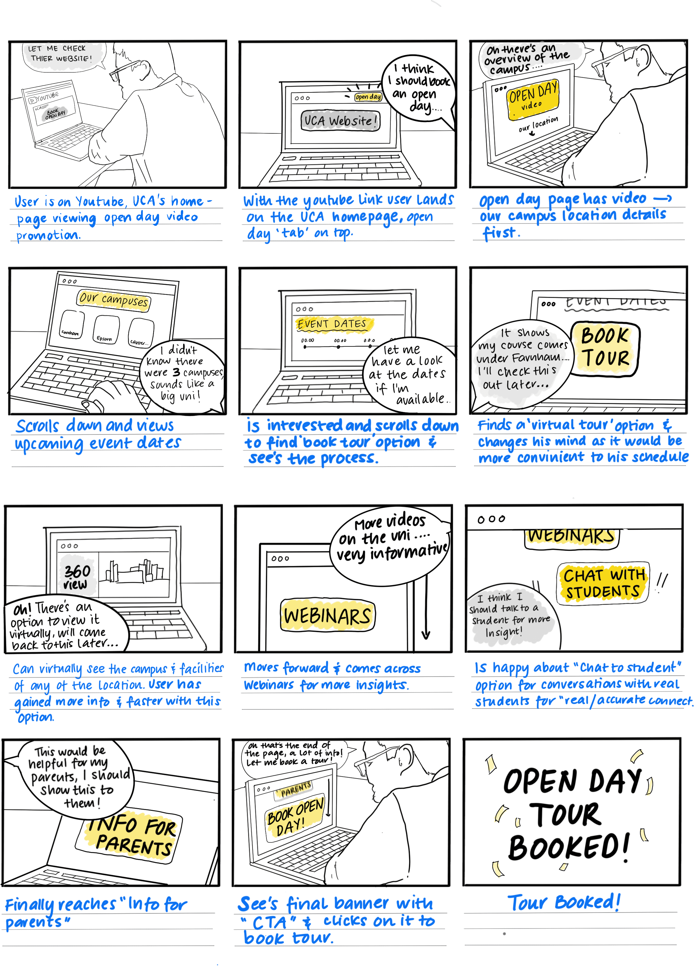 Abuman Pal, a prospective student, begins his journey on UCA’s YouTube before transitioning to the main course page, where unclear navigation and poor section hierarchy hinder his experience. In the Fees & Funding section, he skips key details due to overwhelming content. During the campus tour, interactive features engage him, but excessive navigation steps cause confusion. Finally, the booking process becomes challenging with unnecessary clicks and redirects. These issues emphasize the need for streamlined processes, clearer pathways, and better content prioritization.